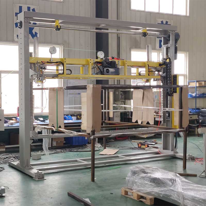This machine is used with the pallet wrapping and conveying line automatically in no need of manual operation.This machine is mainly equipped by Frame, strapping head, belt feeding unit, belt ring plate unit and control platform.